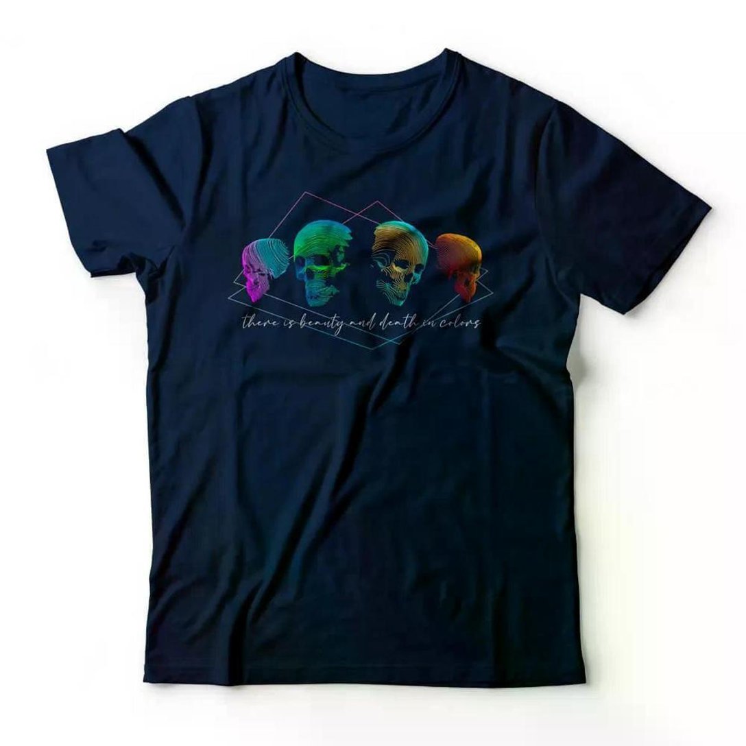 Informações do Produto. • Tecido: 100% algodão 30.1 penteado, com tratamento Confort que proporciona toque macio e com critérios corretos de sustentatibilidade. • Cor: Azul Marinho. • Costuras reforçadas no colarinho e ombros. • Tipo de impressão: DTG - Impressão digital direta no tecido com toque zero e alta durabilidade. Sobre a Estampa. • Arte exclusiva com tema de caveiras. • Design feito por Studio Geek. • Estampa levemente desbotada estilo Vintage. • Atenção: As cores podem apresentar diferenças de tonalidades devido a iluminação e variação de monitores.