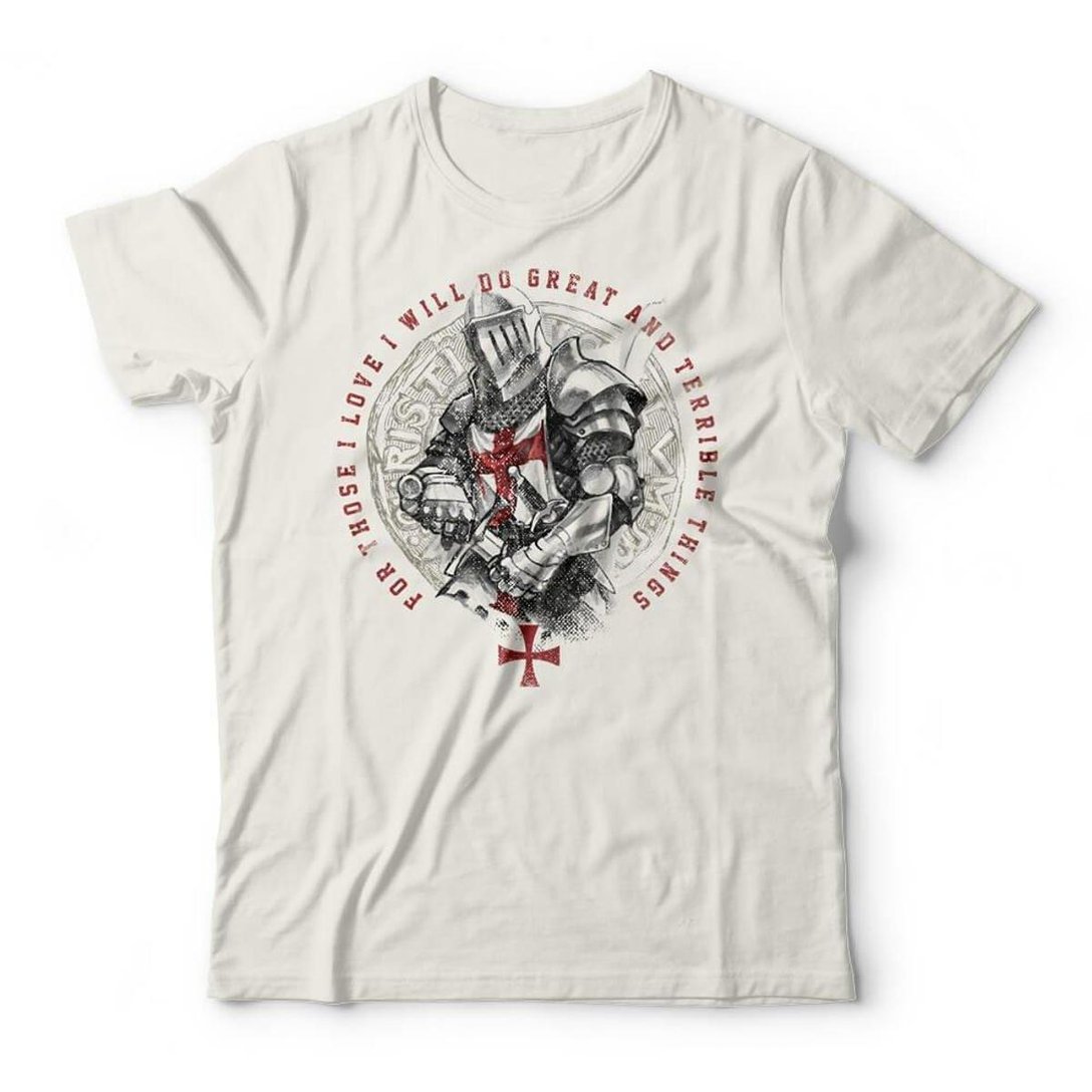 Informações do Produto. • Tecido: 100% algodão com tratamento Confort que proporciona toque macio e com critérios corretos de sustentatibilidade. • Cor: Off White. • Costuras reforçadas no colarinho e ombros. • Tipo de impressão: DTG - Impressão digital direta no tecido com toque zero e alta durabilidade. Sobre a Estampa. • Arte exclusiva com tema de Cavaleiros Templários. • Design feito por Studio Geek. • Estampa levemente desbotada estilo Vintage. • Atenção: As cores podem apresentar diferenças de tonalidades devido a iluminação e variação de monitores.