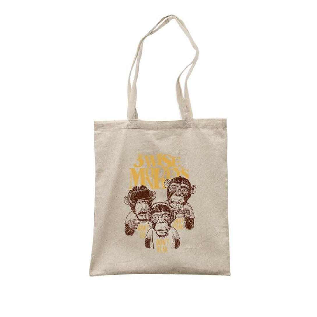 Informações do Produto • Tecido: 100% Algodão Lona (Obs: por ser de fibra natural poderá ocorrer um leve encolhimento após a lavagem) • Cor: Cru • Medidas: 35cm x 40cm (Largura x altura) • Estampa apenas na frente • Tipo de impressão: DTG - Impressão digital direta no tecido com toque zero e alta durabilidade Sobre a Estampa • Arte exclusiva com tema dos três macacos sábios • Design feito por Studio Geek • Estampa levemente desbotada estilo Vintage • Atenção: As cores podem apresentar diferenças de tonalidades devido a iluminação e variação de monitores
