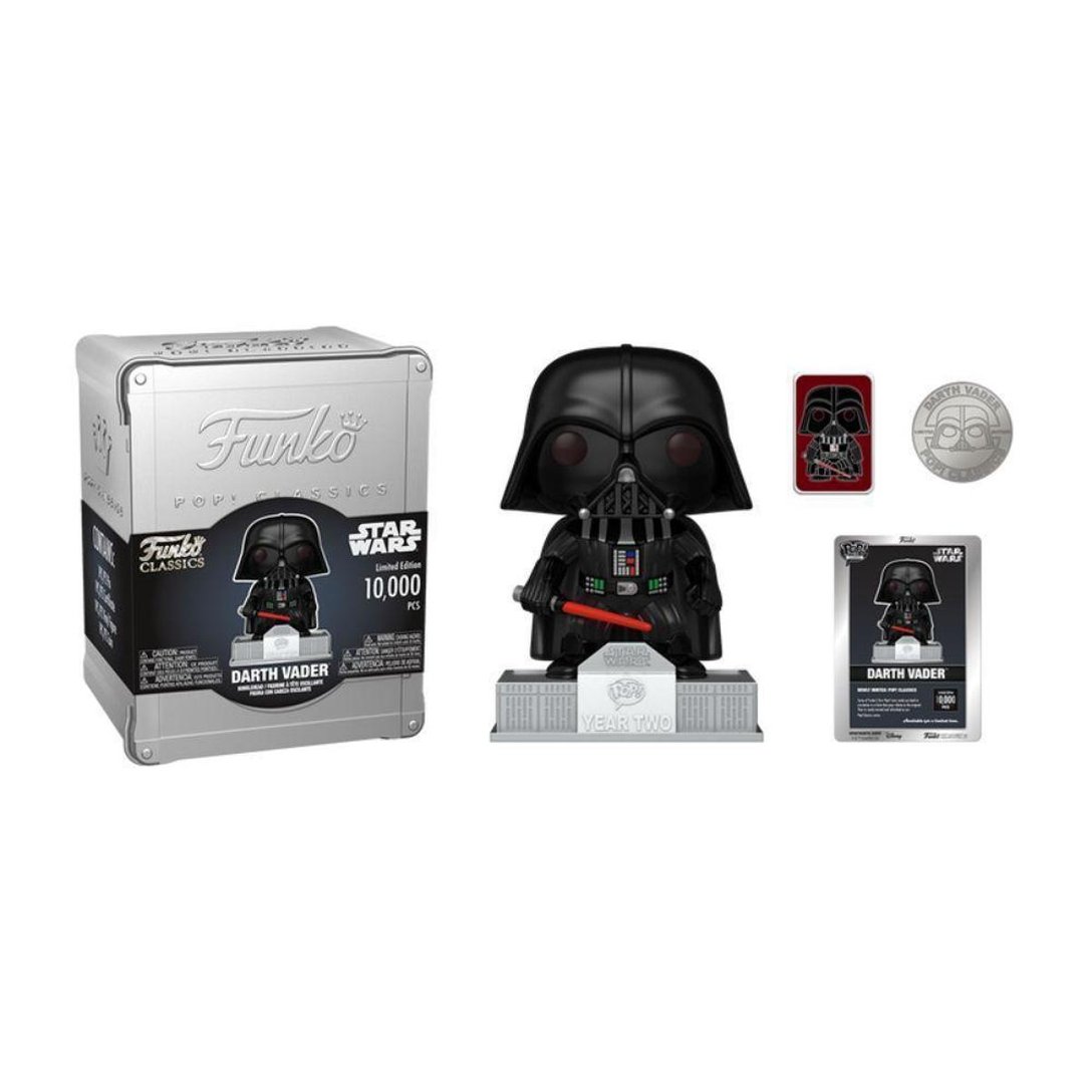 Desperte todo o potencial da sua coleção com os novíssimos Pop! Classics! Alguns dos seus queridos Pops! originais estão de volta com um toque elaborado e elegante. Agora é a hora de receber o Boneco Funko POP! Darth Vader na sua coleção de Star Wars!. Esta coleção exclusiva vem em uma base destacável e é embalada em uma caixa prateada, que se encaixa perfeitamente dentro de uma caixa protetora de lata. A caixa de lata é revestida com um almofadado preto e aveludado, e foi feita para se assemelhar a uma porta de cofre, que se abre para revelar o Pop! Darth Vader!. Além disso, esta figura Pop! Classics inclui um Pin Pop! e uma Moeda Pop! de aço, ambos apresentando o rosto do Pop! Darth Vader, juntamente com um Cartão de Certificado em folha dourada detalhando suas informações biográficas. Apenas 10.000 unidades desta edição limitada foram produzidas! A figura de vinil tem aproximadamente 11 centímetros de altura.