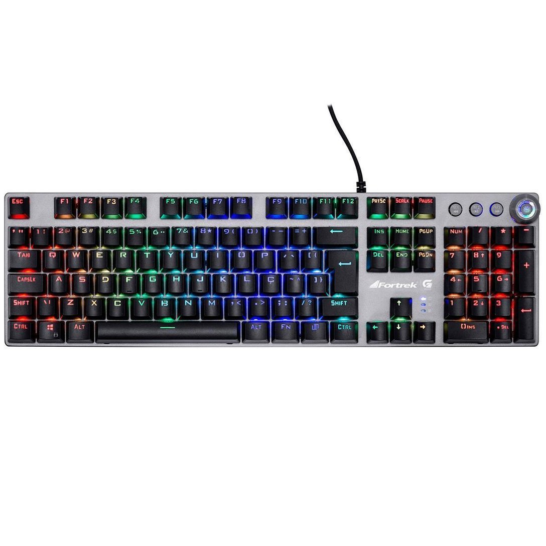 O Teclado Mecânico Fortrek GPRO K7 combina bom gosto com uma construção única. Com iluminação de LED Rainbow, Switch Mecânico KRGD Azul e três teclas Macro já programadas você irá elevar o nível da sua gameplay. . ::Especificações técnicas . Marca: Fortrek . Modelo: 67702 . - Tipo de teclado: mecânico . - Comprimento do Cabo: 1,7M . - Knob de função dupla: Iluminação e multimídia . - 3 teclas Macro já programadas M1 / M2 / M3 . - Apoio de pulso imantado: muito mais conforto e prático . - Painel superior de alumínio para melhor qualidade e acabamento . - Teclas duplamente injetados em policarbonato e plástico ABS . - Resistente a respingos . - Cabo: Têxtil . - Layout: ABNT2 . - Switch Mecânico: KRGD Azul . - Material: Corpo em alumínio + Teclas duplamente injetados em policarbonato e plástico ABS . - Plug and play . - Teclas impressas a laser . Iluminação: - LED RGB (Rainbow) . - Efeitos 13 sendo 9 estáticos . Conector: - USB Banhado a ouro . Dimensão total: - 435 x 123 x 38,5 mm . Conteúdo da embalagem: - 1 x Teclado Mecânico Fortrek GPRO K7 - 67702 .